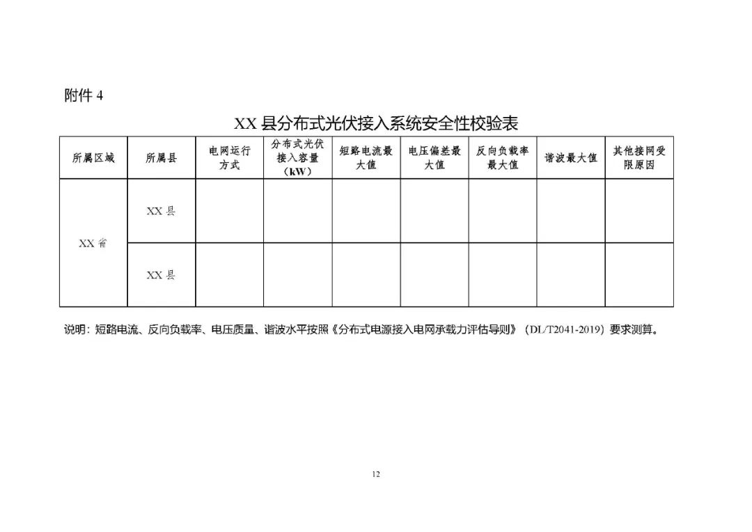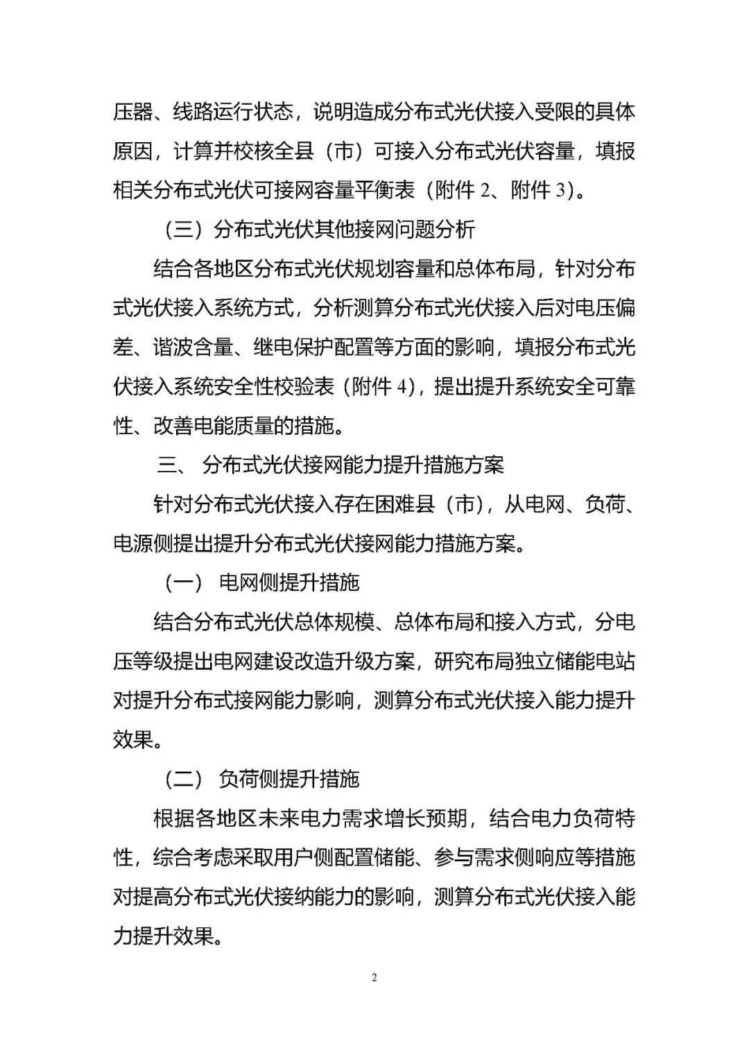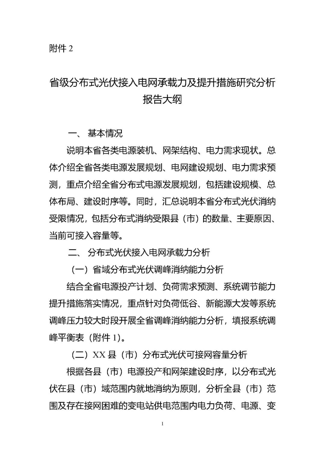 国家能源局综合司关于印发开展分布式光伏接入电网承载力及提升措施评估试点工作的通知国能综通新能〔2023〕74号 各省(自治区、直辖市)能源局,有关省(自治区、直辖市)及新疆生产建设兵团发展改革委,各派出机构,国家电网有限公司、南方电网有限责任公司、内蒙古电力(集团)有限责任公司、新疆生产建设兵团电力集团有限责任公司,全国新能源消纳监测预警中心: 为贯彻落实党的二十大精神,积极稳妥推进碳达峰碳中和工作,充分发挥分布式光伏在推进我国新型能源体系建设中的积极作用,着力解决分布式光伏接网受限等问题,拟在全国范围选取部分典型省份开展分布式光伏接入电网承载力及提升措施评估试点工作,逐步探索积累经验,为全面推广相关政策措施奠定基础。现将有关事项通知如下: 一、试点范围 综合考虑近年来分布式光伏装机增速、装机规模、光伏消纳利用情况等因素,选择山东、黑龙江、河南、浙江、广东、福建6个试点省份,每个省选取5-10个试点县(市)开展试点工作。 二、有关要求 请各试点省份能源主管部门会同电网企业按照《分布式光伏接入电网承载力及提升措施评估试点实施方案》要求,积极有序开展试点工作,按期完成年度研究评估和结果公布相关工作,国家能源局将组织开展抽查,并在此基础上完善评估办法。 试点省份能源主管部门要统筹推进省内试点各项工作。各省电网企业负责营业区内电网承载力及提升措施的具体研究分析工作,并协助本省能源主管部门做好相关发布工作。国家能源局各派出机构会同地方能源主管部门做好分布式光伏接入电网条件的监管工作,接受社会各方意见建议,及时反映工作推进中遇到的问题,促进分布式光伏健康有序发展。非试点省份可根据本省(区、市)实际情况,参照试点省份开展相关工作。 试点工作时间为期1年。 联系电话:010-81929506 附件: 1.分布式光伏接入电网承载力及提升措施评估试点实施方案 2.省级分布式光伏接入电网承载力及提升措施研究分析报告大纲 国家能源局综合司 2023年6月1日 附件1 分布式光伏接入电网承载力及提升措施评估 试点实施方案 为适应分布式光伏快速发展需要,提升电网接纳分布式光伏能力,充分发挥分布式光伏的电力保供作用,加快构建新能源占比逐渐提高的新型电力系统和新型能源体系,制定本方案。 一、试点工作目的 随着分布式光伏等新能源装机规模的持续提升,区域电源结构、负荷特性、网架结构、调控方式等不断变化,部分地区出现调节能力不足、反送功率受限、电压偏差过大等制约分布式光伏接入的问题。为适应分布式光伏快速发展需要,有效解决分布式光伏接网问题,及时总结可供推广的经验,确保分布式光伏“应接尽接”,推动分布式光伏高质量发展,科学合理评估分布式光伏接入电网的承载能力,建立完善的定期评估、发布等机制十分必要。 二、工作原则 促进发展。系统梳理分布式光伏并网存在的“堵点”“难点”“痛点”,指导和督促电网企业开展分布式光伏接入电网评估等相关工作,为分布式光伏持续健康发展创造有利条件和良好环境。 科学合理。坚持科学评估,坚持系统观念,统筹考虑经济高效、安全运行等因素,以最大程度提高分布式光伏接入电网承载能力为目标,开展研究评估工作。 鼓励创新。充分考虑当前电力系统技术进步,积极评估采用新型配电网、新型储能、负荷侧响应、虚拟电厂等措施打造智能配电网,挖掘源、网、荷、储的调节能力,提高分布式光伏接入电网承载能力。 试点先行。统筹分布式光伏与电网发展,优先选取接入容量大、渗透率高的部分地区开展分布式光伏接入电网承载力及提升措施的试点研究,探索积累经验、统一完善评估标准,为全面推广奠定基础。 三、总体安排 (一)以电网企业为主体按年度组织开展接网承载力及提升措施研究分析 国家电网、南方电网等电网企业应组织相关试点省份电网公司参考《分布式电源接入电网承载力评估导则》(DL/T 2041-2019,以下简称《导则》)及本文件相关要求,结合供电营业区域内分布式光伏2~3年发展实施方案及电网规划、负荷发展水平、资源开发潜力、项目储备等情况,按年度组织对本企业营业区内县(市)一级电网接纳分布式光伏能力进行排查和梳理,以省级为单位组织编写《省级分布式光伏接入电网承载力及提升措施研究分析报告》(以下简称《分析报告》),并对高压输电网制约分布式光伏接入的县(市)按照《分析报告》要求开展专题分析,提出针对性的解决措施及相关工作计划。低压配电网承载能力按照良好(30%以下的台区按照《导则》评估为黄色、红色等级)、一般(30%~80%的台区按照《导则》评估为黄色、红色等级)、受限(80%以上的台区按照《导则》评估为黄色、红色等级)划分接网预警等级。《分析报告》应成为电力发展规划中电网和分布式光伏发展目标及布局的重要依据。 《分析报告》由省级电网企业组织编制,报省级能源主管部门、国家能源局派出机构,并同步上传至全国新能源电力消纳监测预警平台。国家电网、南方电网等电网企业汇总营业区内各省级研究分析报告,于今年8月底前统一报送国家能源局。 (二)省级能源主管部门组织电网企业公布评估结果并做好接网工作 电网企业于今年9月底前将本区域评估结果报省级能源主管部门
