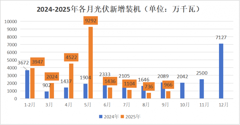 其中2025年1-9月,国内新增光伏装机240.27GW,同比增长49.35%;计算可得9月单月光伏新增规模9.66GW,对比8月数据来看,环比增长31.25%,对比去年同期数据,同比下降53.76%。