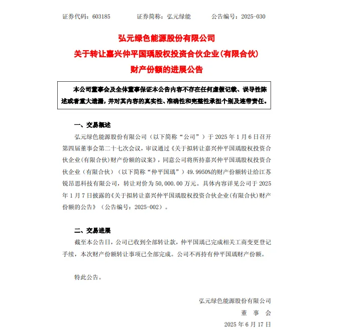 翻开弘元绿能近期公告,一条关键信息映入眼帘:公司已正式完成对嘉兴仲平国瑀49.995%股权的转让,彻底退出戈恩斯能源的投资链条。