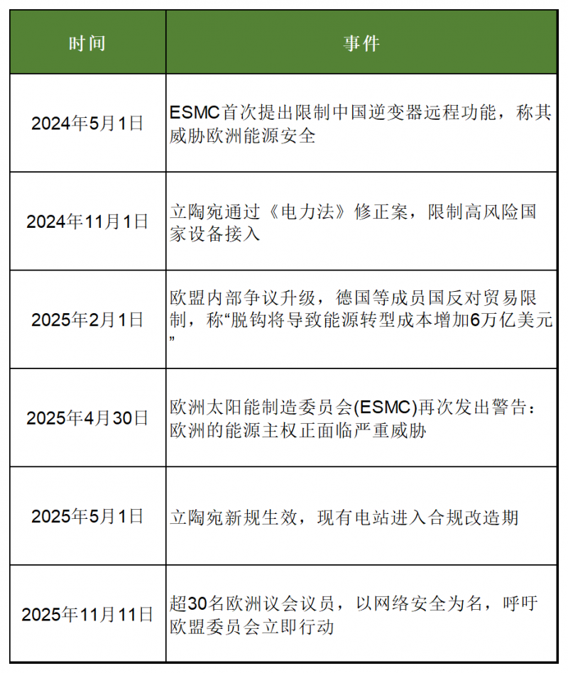 早在2024年5月,ESMC就曾公开呼吁“限制非欧洲制造商的远程控制功能”,并宣称中国产逆变器占据欧洲市场70%的份额,存在“网络安全风险”。