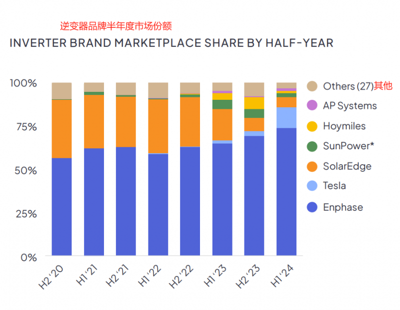 当然,也不要忽视本土逆变器巨头的实力。Enphase、SolarEdge等本地品牌凭借专利、渠道和服务优势牢牢占据市场。其占有率多夸张,从下图中可见一斑。