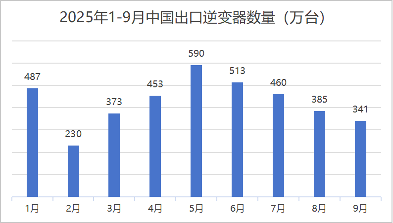 中国海关总署最新发布的2025年9月份逆变器出口数据显示:2025年1-9月中国海关出口逆变器累计3832万台,其中9月出口341万台,环比同比均有所下降。