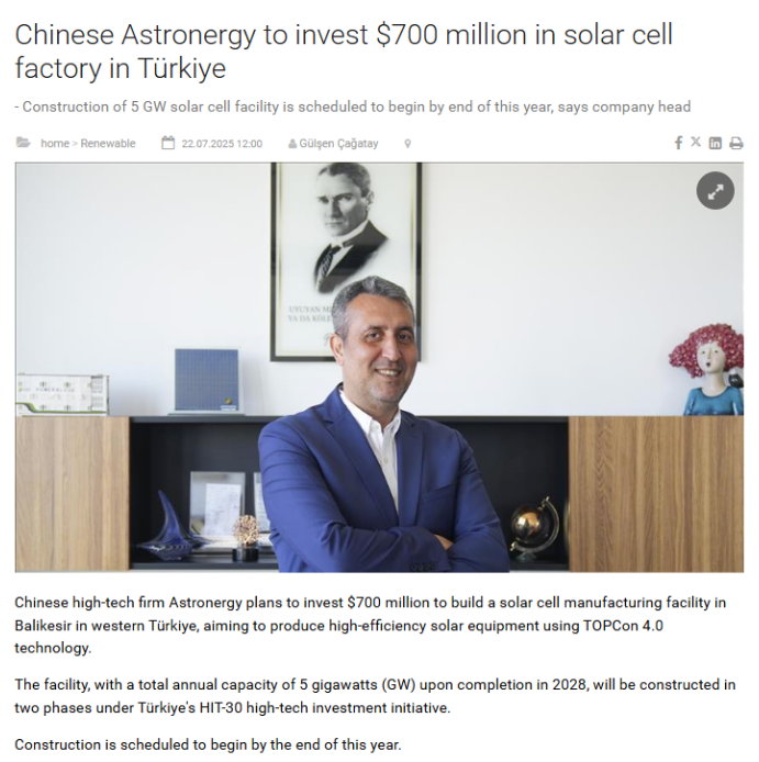 所谓“HIT-30高科技投资计划”,是土耳其政府于2024年7月推出,旨在吸引国际企业在电动车、半导体、电池及可再生能源等领域投资,目标总投资额达300亿美元。此前,比亚迪已宣布投资10亿美元在土耳其建设电动车工厂,正泰新能则是该国唯一一家100%外资控股的太阳能电池制造商。