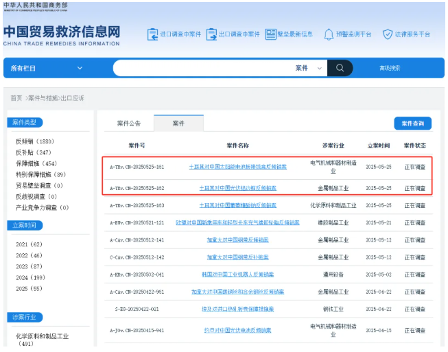 今年5月,土耳其贸易部连发两则公告,对原产于中国的太阳能电池板接线盒以及光伏铝边框启动反倾销调查。