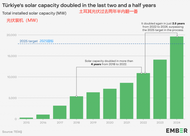 土耳其地处亚欧交界,日照资源极佳,年均日照时长超2700小时。政府也是雄心勃勃,计划到2035年将风光装机提升至120GW。