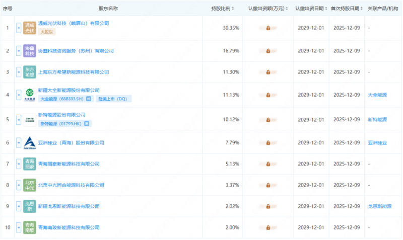 根据企查查股东信息,十大股东分别为通威、协鑫、东方希望、大全、新特、亚洲硅业、青海丽豪等企业。其中通威为第一大股东,持股比例30.35%。