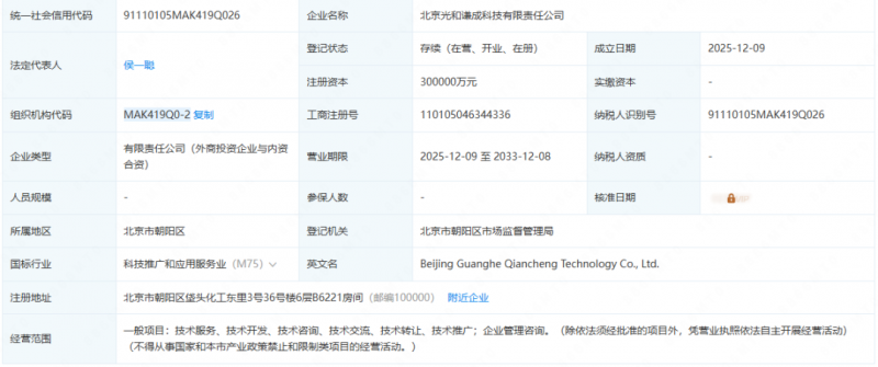 12月9日,北京光和谦成科技有限责任公司注册成立,公司注册资本30亿元,法定代表人为侯一聪,董事长为钱程。