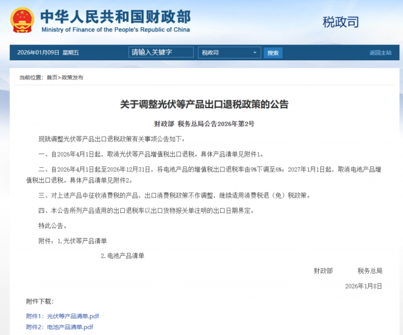 1月8日,财政部、税务总局公告称,自2026年4月1日起,取消光伏等产品增值税出口退税。自2026年4月1日起至2026年12月31日,将电池产品的增值税出口退税率由9%下调至6%;2027年1月1日起,取消电池产品增值税出口退税。