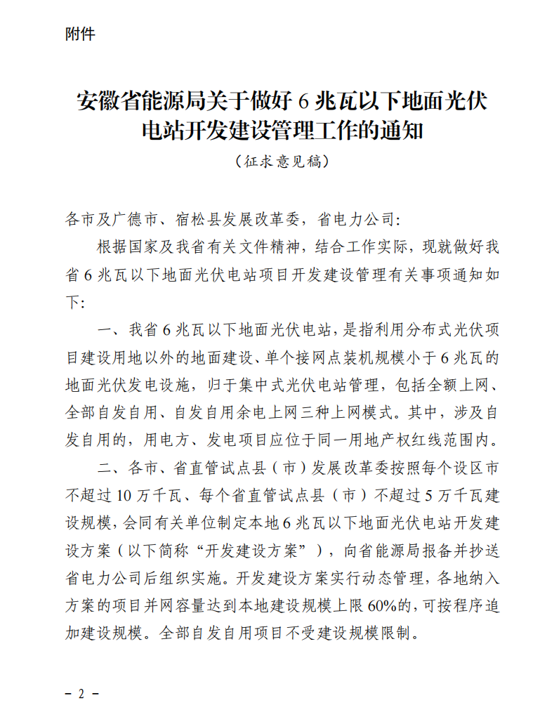 2月11日,安徽省能源局在其官方网站发布了《安徽省能源局关于做好6兆瓦以下地面光伏电站开发建设管理工作的通知(征求意见稿)》,并向社会公开征求意见。