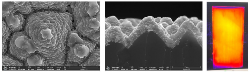 图示:上海叶烁制备钙钛矿-晶硅叠层电池,毯式覆盖的钙钛矿层SEM&PL图