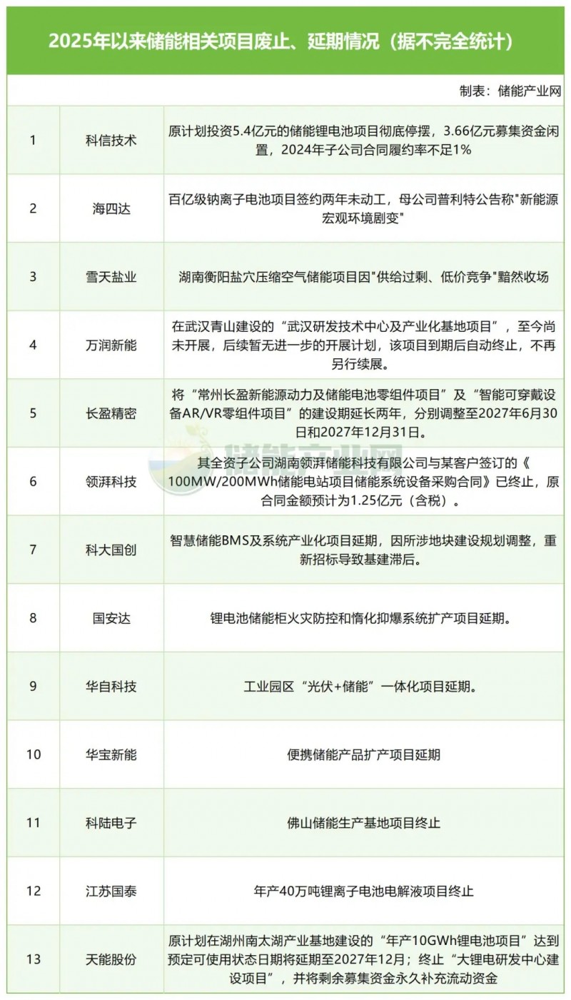 除了地方区域废止一系列储能项目以外,在行业阵痛下,存在一大部分储能企业、跨界企业终止、延期储能相关项目,具体如下所示: