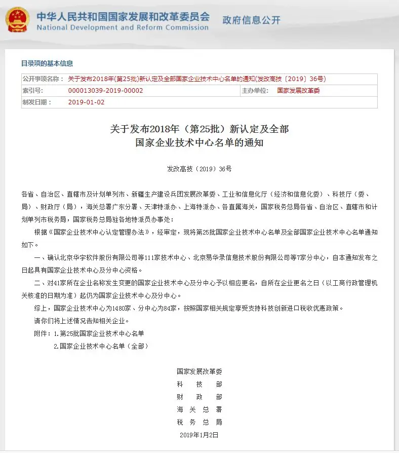 一、确认北京华宇软件股份有限公司等111家技术中心、北京易华录信息技术股份有限公司等7家分中心,自本通知发布之日起具有国家企业技术中心及分中心资格。