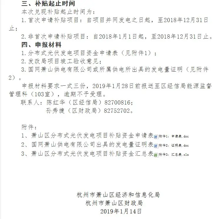 1月14日,杭州市萧山区经济和信息化局,杭州市萧山区财政局发布《关于申报2018年度萧山区光伏项目补助资金的通知》,要求符合条件已实施分布式光伏发电项目的企业申报2018年度分布式光伏补贴。
