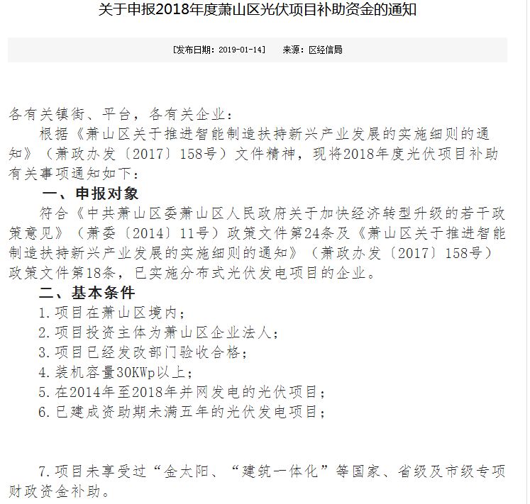 通知指出:符合《中共萧山区委萧山区人民政府关于加快经济转型升级的若干政策意见》(萧委〔2014〕11号)政策文件第24条及《萧山区关于推进智能制造扶持新兴产业发展的实施细则的通知》(萧政办发〔2017〕158号)政策文件第18条,已实施分布式光伏发电项目的企业,可申报2018年度分布式光伏补贴。