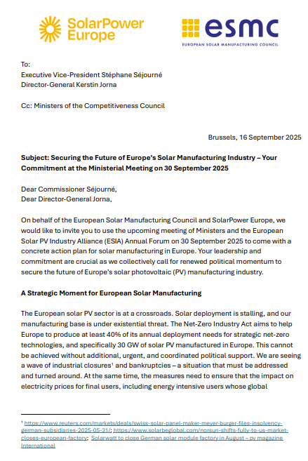 致信中提到,“欧洲太阳能产业正处在十字路口。光伏部署陷入停滞,我们的制造基地面临生存危机。”