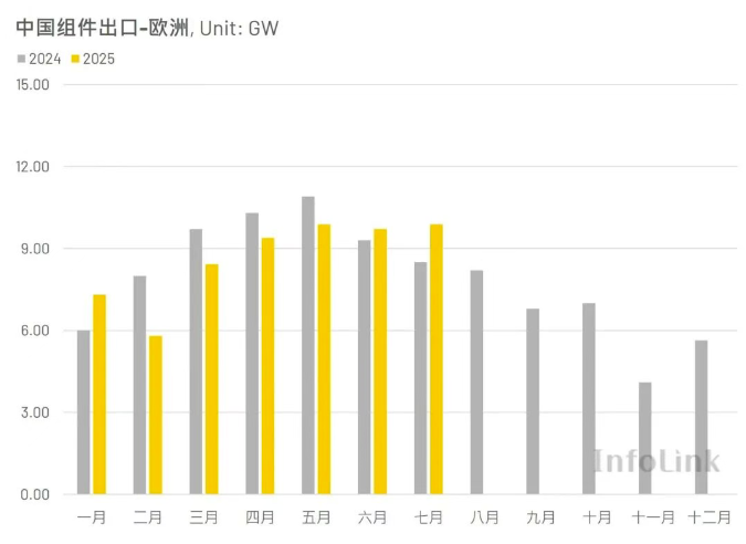目前,欧盟太阳能产品进口高度依赖中国供应链。2022年与2023年,中国对欧盟出口的光伏组件量约占全球总出口量的50%。根据Infolink海关数据统计,2025年1-7月,中国累计向欧洲市场出口的光伏组件约为60.4GW。