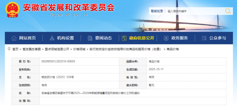 10月11日,安徽省发展改革委发布《关于开展2025—2026年新能源增量项目机制电价竞价工作的通知》。