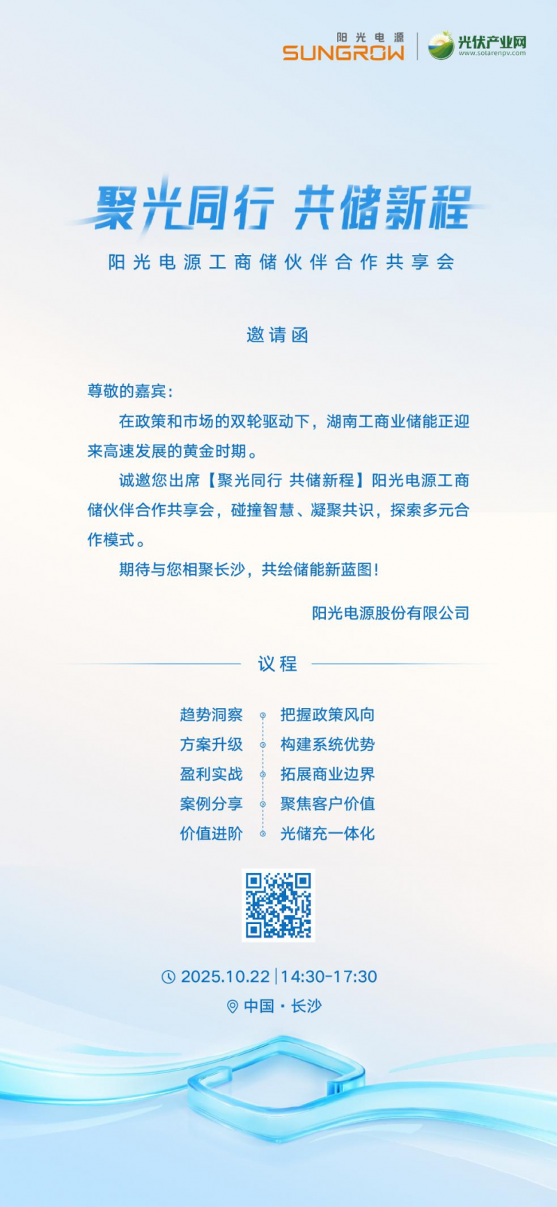 10月22日,阳光电源将于中国·长沙举办“工商储伙伴合作共享会”