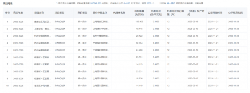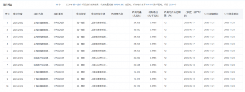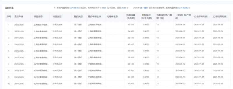 11月24日,上海2025-2026年新能源增量项目机制电价竞价结果公示。