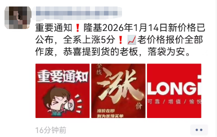 “组件价格天天在涨。”一位经销商无奈表示。1月13日,天合光能国内组件指导价上调至0.85-0.89元/W,高于当前实际成交价20%;1月14日,隆基绿能、TCL中环、正泰(除710外)的组件产品每瓦都上涨0.5分,锁货的爱旭股份产品上涨2分;1月15日最新消息,部分头部厂商的订单报价已突破0.85元/W,而且还要再涨!