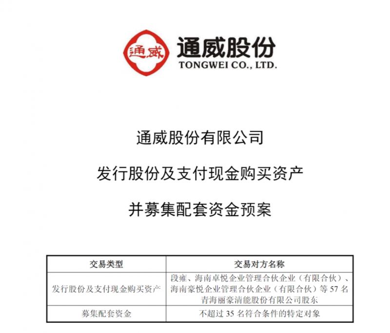 就在不久前,行业另一龙头通威股份也正式披露发行股份及支付现金购买资产并募集配套资金预案,拟通过发行股份及支付现金相结合的方式,收购丽豪清能100%股权。