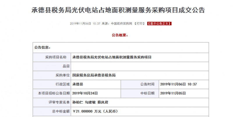 近日,从政府采购网站上了解到,某地税务局已通过公开招标手段完成当地光伏电站占地面积的测量,中标价21万。