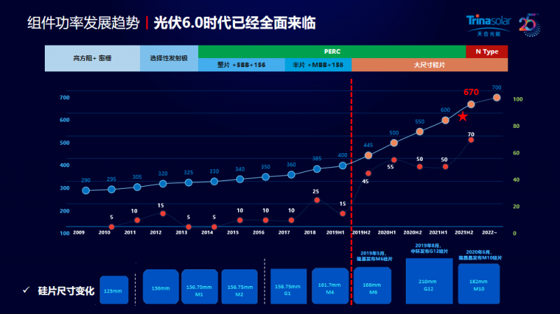 天合光能一直专注太阳能应用技术的研发,多次刷新组件效率的世界纪录,2020年推出了210大尺寸组件产品。在市场需求的不断推动下,基于组件功率发展趋势,天合超高功率组件价值凸显,引领光伏行业进入大尺寸、高功率组件时代。