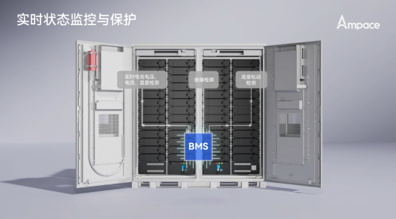 Ampace新能安高安全技术遵循全生命周期安全理念,从客户需求阶段开始思考电池安全,将安全贯穿电池设计、制造、运输、使用和退役整个生命周期。在设计制造阶段,Ampace新能安采用更为安全稳定的材料及洁净精细的制程控制,电芯失效率仅为1 0亿分之一,远低于头部友商,从电芯材料基因层级确保体系本征安全。在电池使用过程中,Ampace新能安自研BMS系统通过精准策略延长电芯寿命,以高精度析锂检测技术提前识别电芯内短路风险与异常,通过云计算技术实时监控电芯安全。