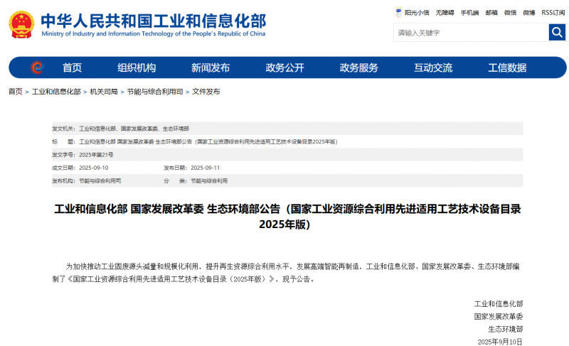 ·9月11日,工信部、国家发改委、生态环境部发布《国家工业资源综合利用先进适用工艺技术设备目录(2025年版)》,重点聚焦光伏组件回收等可再生能源综合利用。