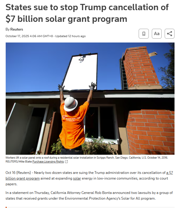 如果顺利实施,该计划预计能为100万美国家庭减少至少20%的电费,每年节省约3.5亿美元。然而,今年8月7日,美国环保署署长李·泽尔丁突然宣布终止该计划,并收回了已拨付资金的约90%。