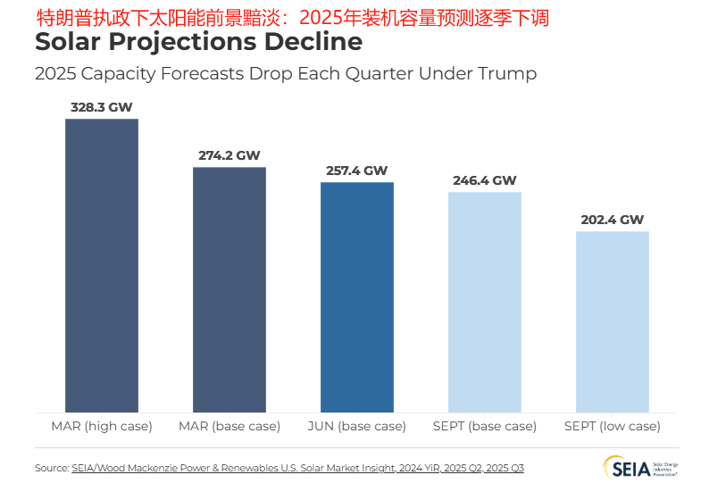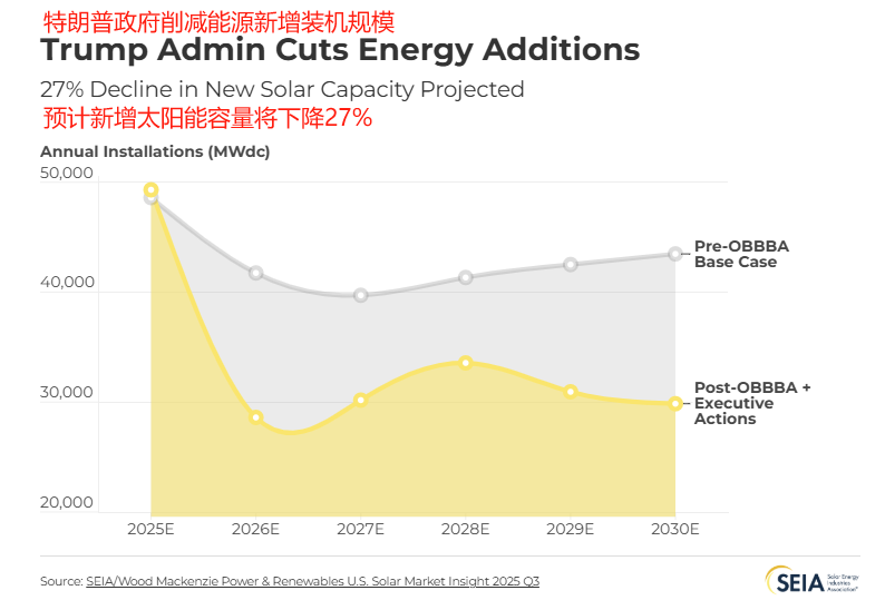 美国太阳能行业协会和伍德麦肯兹的预测显示,特朗普政府的政策可能导致2026年至2030年间新增太阳能装机容量下降27%。