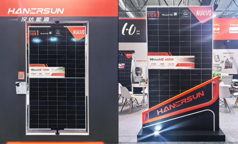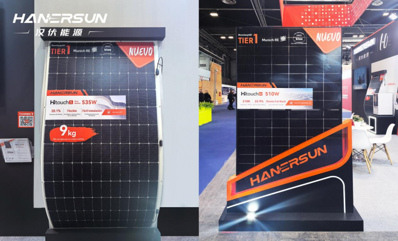 此次展会,汉伏能源柔性青云系列组件HITOUCH 5 535W首次登陆西班牙,吸引众多关注。组件仅重9kg,较传统组件轻70%,无需额外支架即可贴合各类建筑屋顶,完美破解城市老旧建筑屋顶承重难题。HITOUCH 6N 730W及HITOUCH 6N 650W矩形组件同样首秀展会,凭借高功率密度与低衰减特性,可大幅降低南部高辐照地区大型地面电站的度电成本,适配规模化装机需求,成为展台亮点。