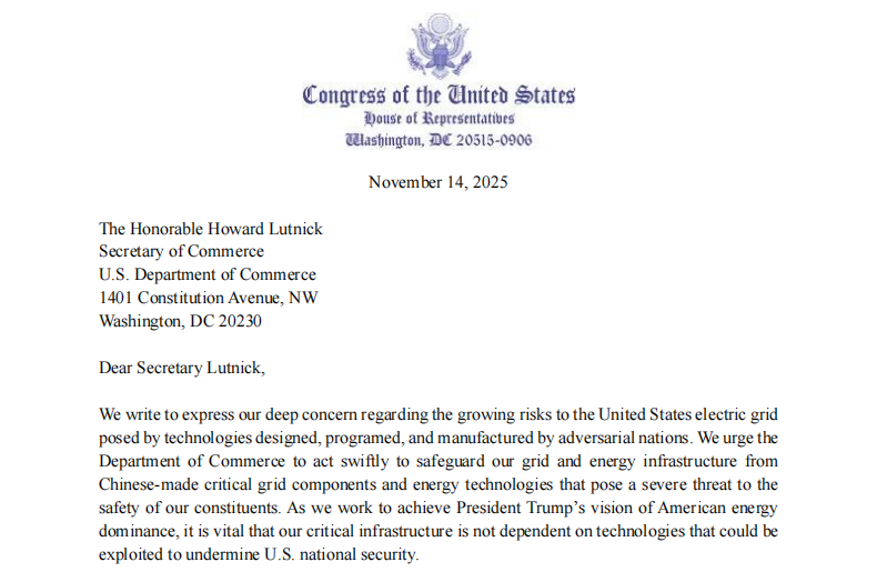 50余名美国共和党众议员联名致信商务部,要求限制中国光伏逆变器及相关储能设备进入美国关键基础设施领域;