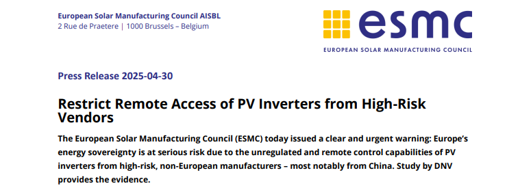 除了此次联名致信之外,在今年4月30日,欧洲太阳能制造委员会(ESMC)还呼吁限制“高风险”制造商(主要是中国的制造商)远程访问欧洲的光伏逆变器。(详情点击>>《欧洲再发文:小心中国逆变器!中国制造又成替罪羊?》)