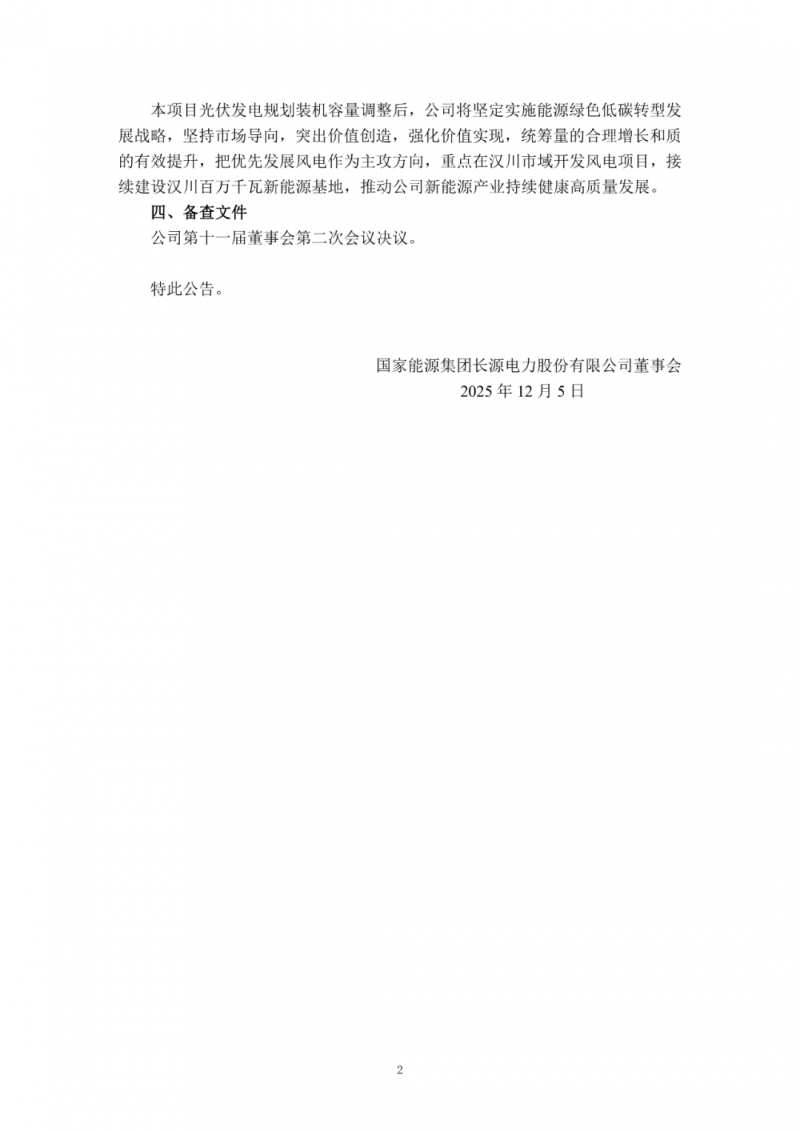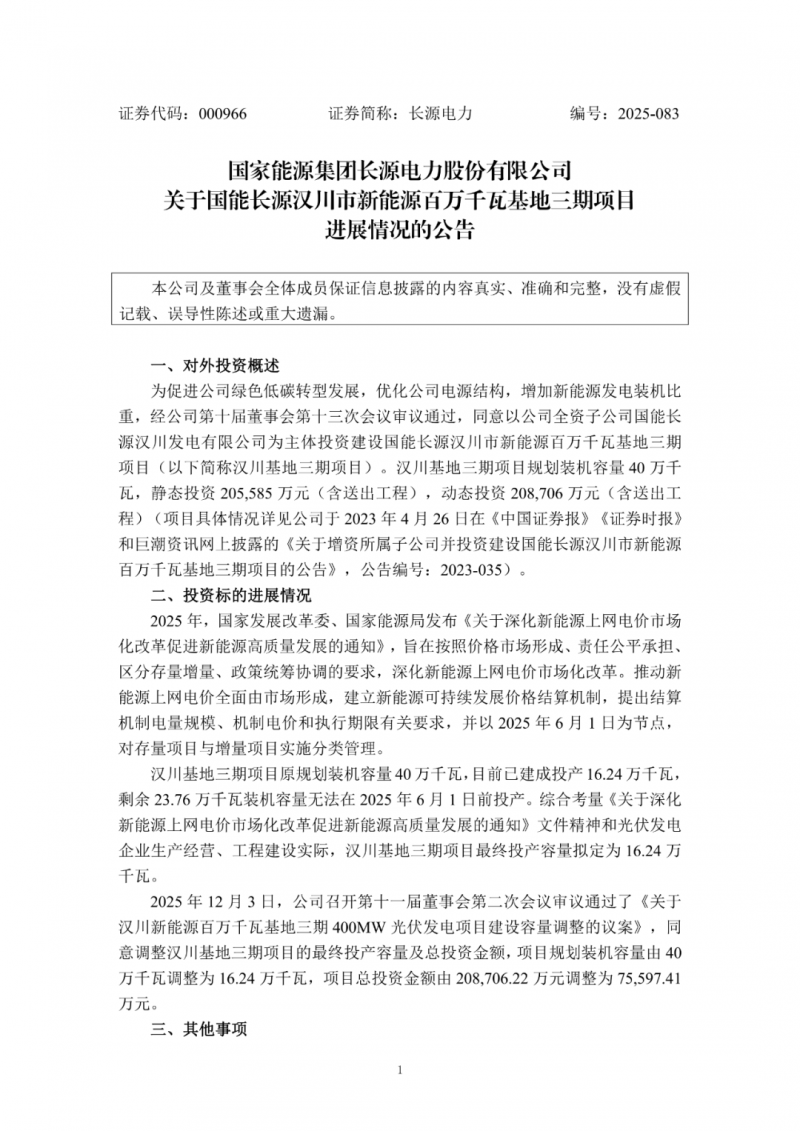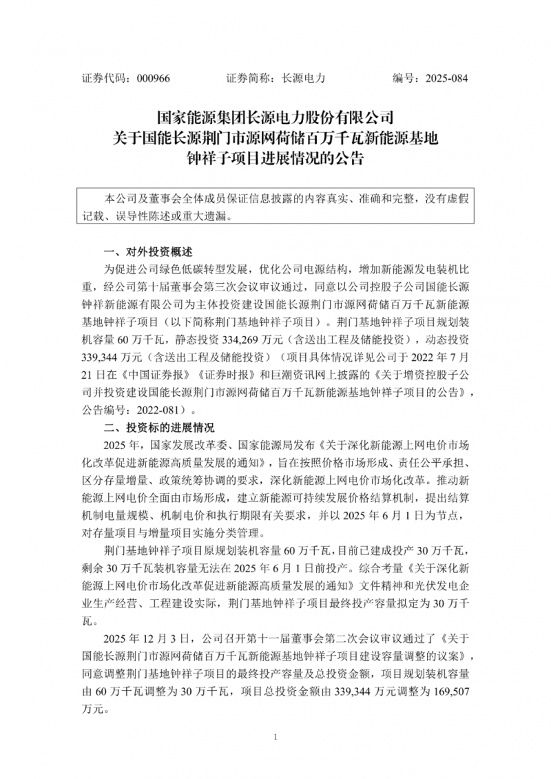 国能长源荆门市源网荷储百万千瓦新能源基地钟祥子项目,因剩余300MW装机容量无法在2025年6月1日前投产,长源电力决定将建设容量由600MW调整为300MW,投资金额由33.93亿元调整为16.95亿元。