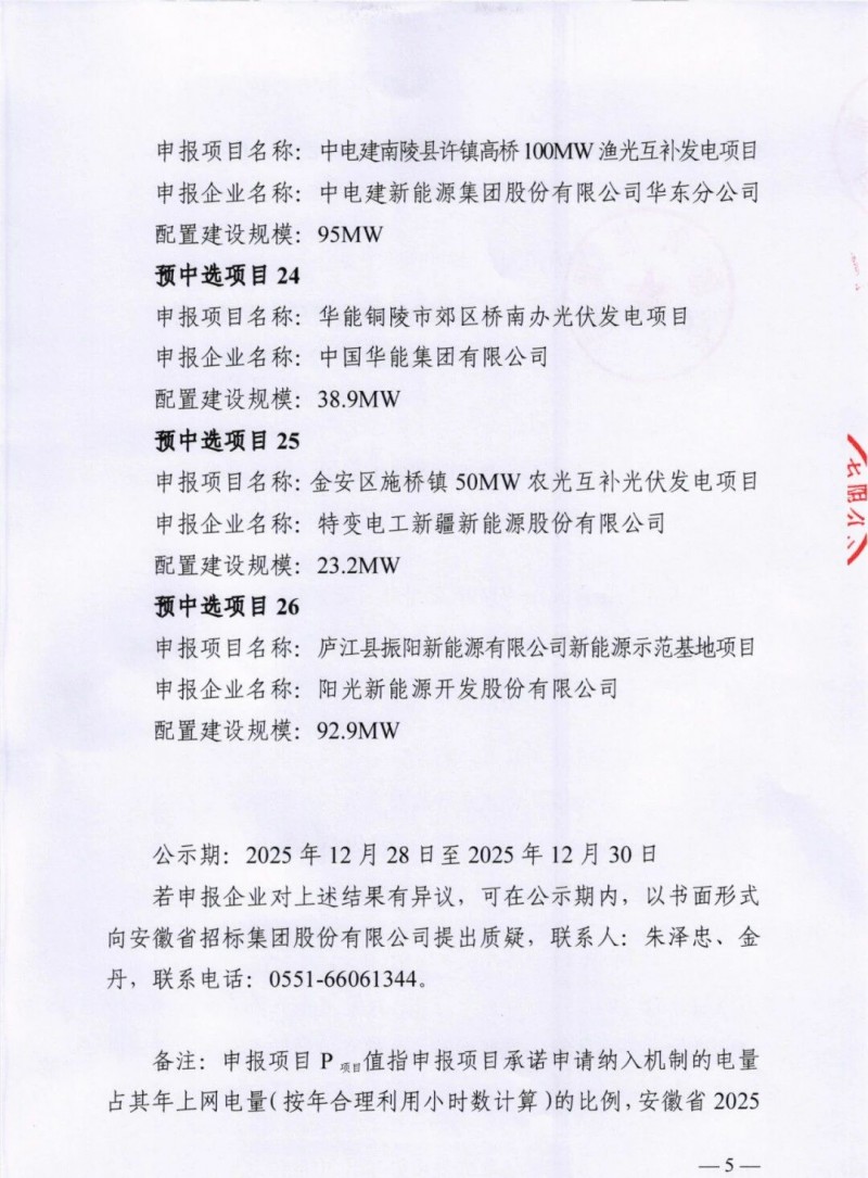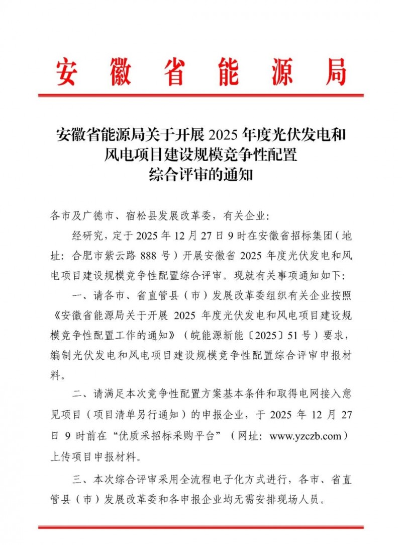12月27日,安徽省2025年度光伏发电项目建设规模竞争性配置中选结果公告发布,共计26个项目入选,规模3GW。