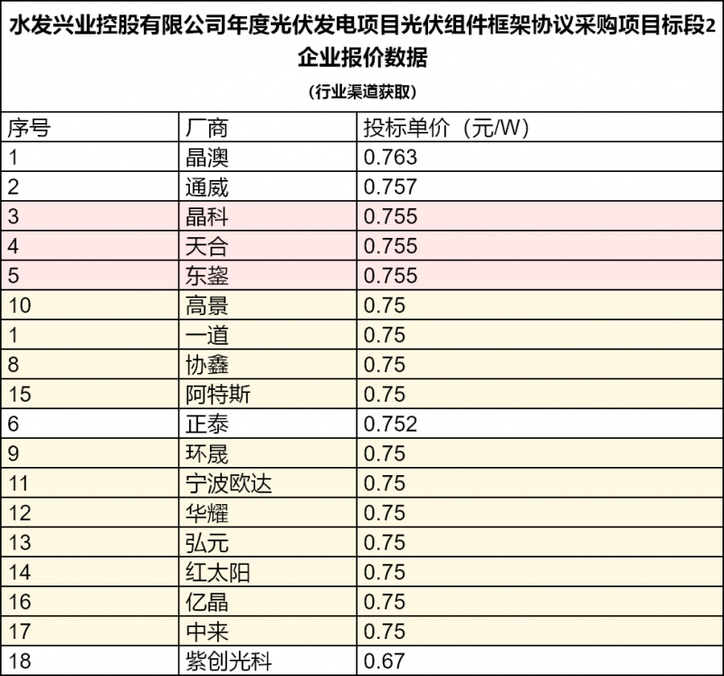 从此次项目的投标数据来看,从公示信息来看,此次投标单价集中在0.75-0.763元/W区间。