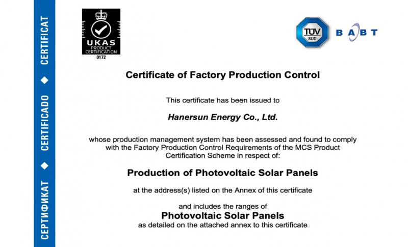 MCS是英国政府支持的可再生能源产品与安装认证体系,长期服务于英国低碳建筑与分布式能源发展。在英国,MCS认证被广泛视为衡量可再生能源产品质量与可靠性的重要参考,也是终端用户获取政府能源补贴及参与余电上网机制的重要前提。认证过程从产品性能、安全性及制造一致性等多个维度,对光伏组件进行了系统性评估,进一步验证了其在长期运行及实际应用场景下的稳定表现。
