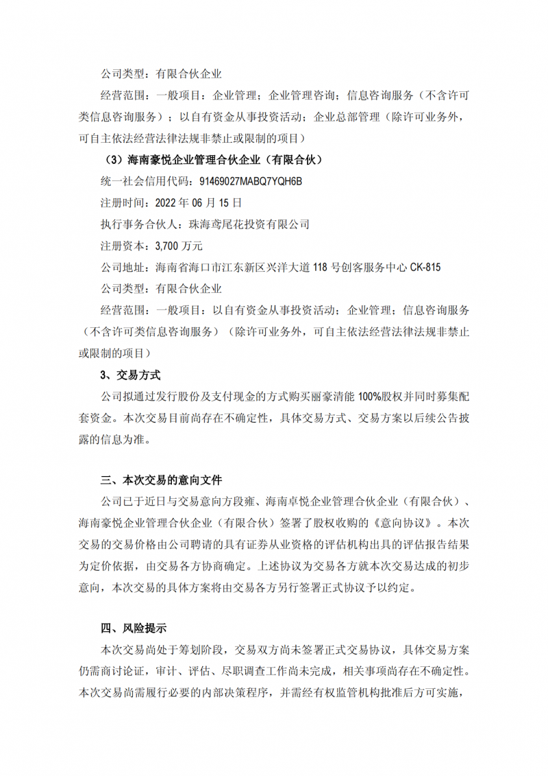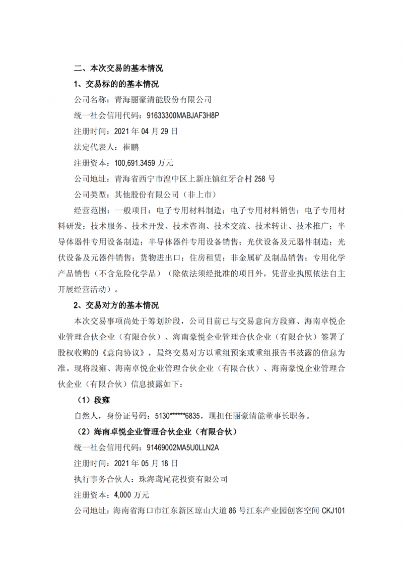 公告显示,通威股份已于近日与交易意向方段雍、海南卓悦企业管理合伙企业(有限合伙)、 海南豪悦企业管理合伙企业(有限合伙)签署了股权收购的《意向协议》。本次交易的交易价格由公司聘请的具有证券从业资格的评估机构出具的评估报告结果为定价依据,由交易各方协商确定。上述协议为交易各方就本次交易达成的初步意向,本次交易的具体方案将由交易各方另行签署正式协议予以约定。