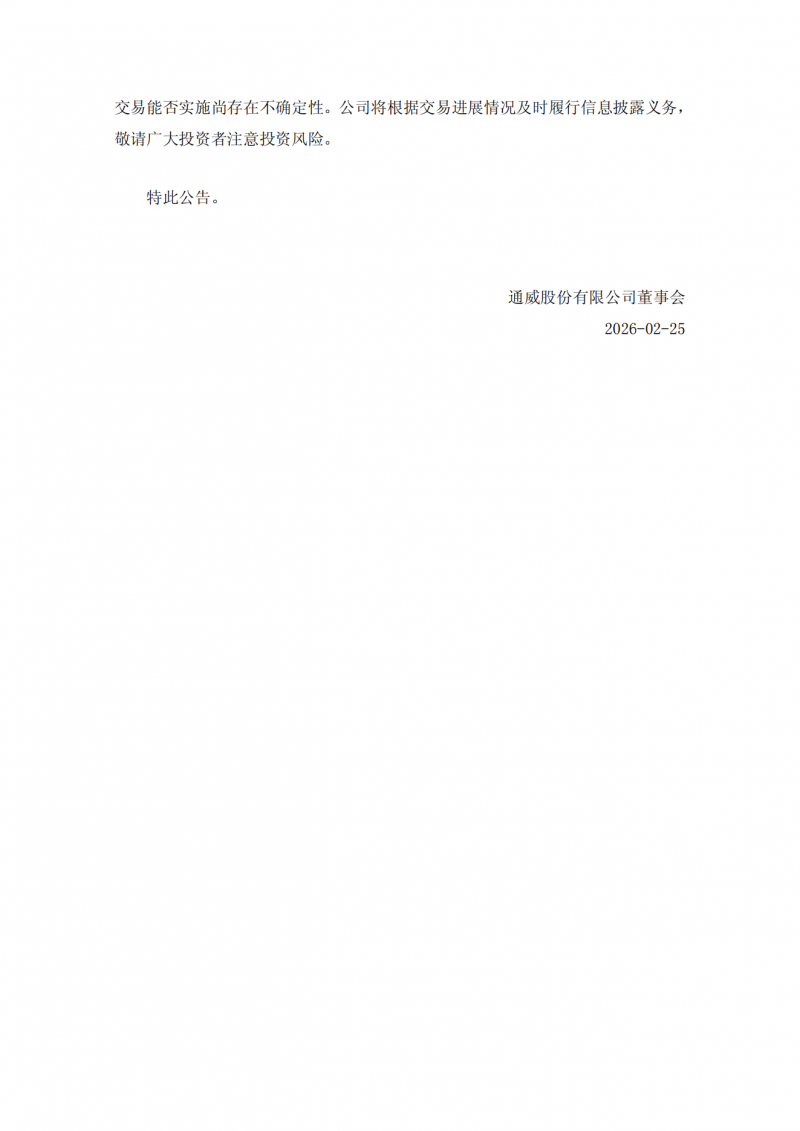 通威股份表示,公司正在筹划通过发行股份及支付现金的方式,购买青海丽豪清能股份有限公司(以下简称“丽豪清能”)100%股权,并募集配套资金(以下简称“本次交易”)。本次交易不会导致公司控股股东、实际控制人变更,不构成关联交易,预计不构成重大资产重组。 因本次交易尚处于筹划阶段,有关事项尚存在不确定性,为保证公平信息披露,维护投资者利益,避免对公司股价造成重大影响,根据上海证券交易所的相关规定,经公司申请,公司股票、可转债债券以及可转债转股自2026年2月25日 (星期三)开市起开始停牌,预计停牌时间不超过10个交易日。